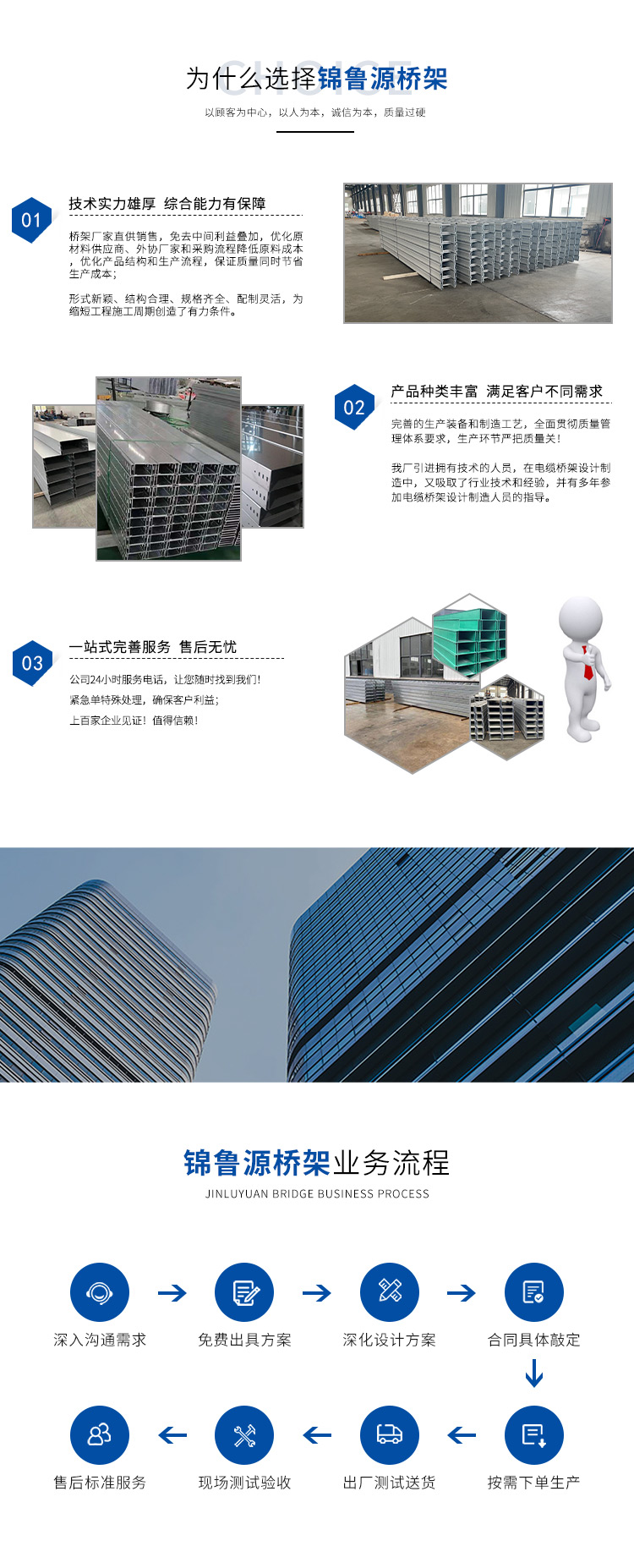 安徽锦鲁源新材料科技有限公司,位于皖东明珠一安徽省天长市,毗邻南京、扬州,占地面积50000平方米,现有员工180、专业专业生产高分子复合型桥架,高分子合金桥架,热浸锌桥架,喷塑桥架,铝合金桥架,不锈钢桥架,玻璃钢复合型桥架,玻璃钢桥架等。本公司致力于研发新型高效环保材料,目前针对高分子复合型桥架具备新型完整的专利及丰富的生产经验,年产能已超百万米。